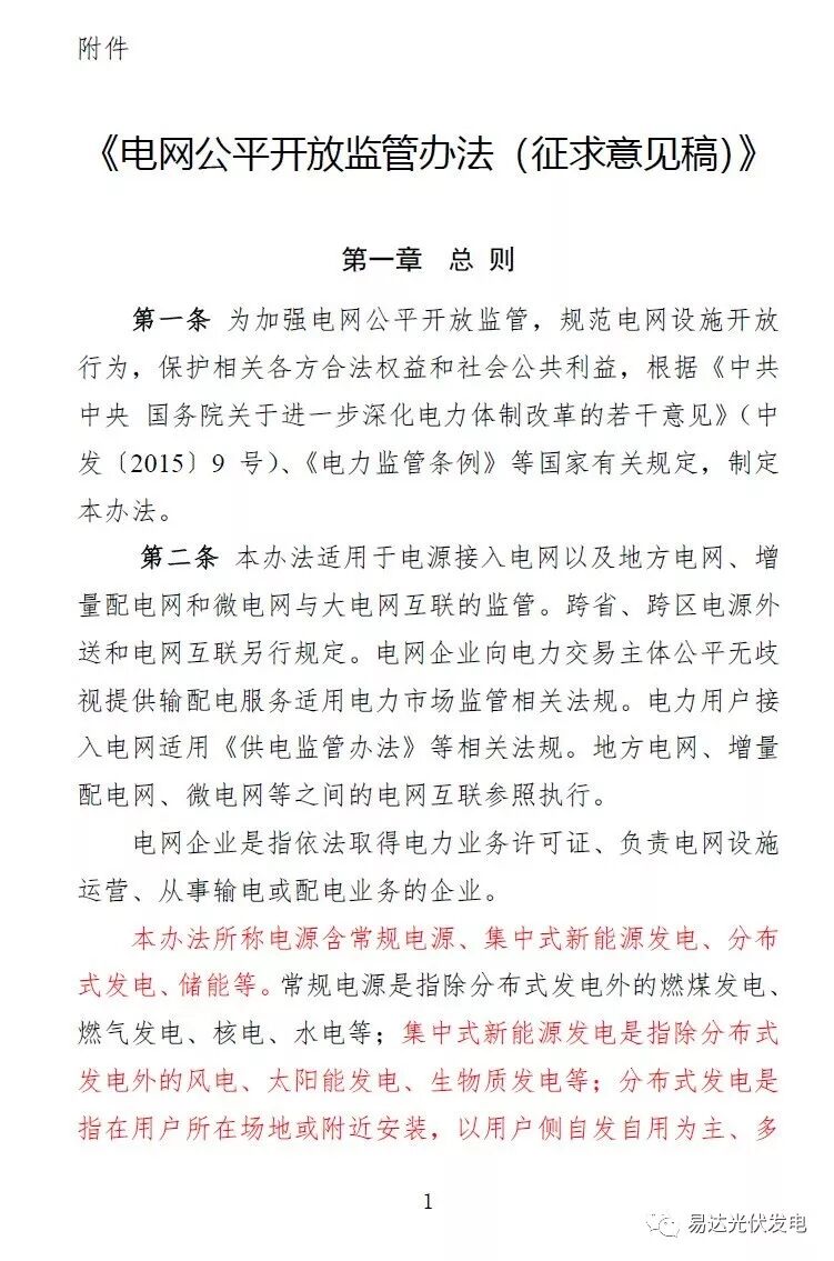 国家能源局日前发布了《电网公平开放监管办法(征求意见稿)》,为加强电网公平开放监管,规范电网设施开放行为,此次公开征求意见的时间为2019年12月6日至2020年1月5日。征求意见稿指出,电网企业应公平无歧视为电源项目提供电网接入服务。该办法所称电源含常规电源、集中式新能源发电、分布式发电、储能等。 详情如下: 关于《电网公平开放监管办法(征求意见稿)》 公开征求意见的公告 为加强电网公平开放监管,规范电网设施开放行为,国家能源局组织开展了《电网公平开放监管办法》制订工作,形成了《电网公平开放监管办法(征求意见稿)》,现向社会公开征求意见。