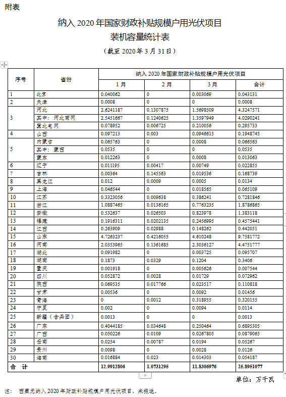 ![]() 按照《国家能源局关于2020年风电、光伏发电项目建设有关事项的通知》(国能发新能〔2020〕17号)和《国家能源局综合司关于2019年户用光伏项目信息公布和报送有关事项的通知》(国能综通新能〔2019〕45号)关于户用光伏项目管理有关要求,全国共有30个省份报送了户用光伏项目信息(西藏无纳入2020年财政补贴规模户用光伏项目,未报送)。 根据各省级能源主管部门、电网企业报送信息,经国家可再生能源信息管理中心梳理统计,截至2020年3月底,全国累计纳入2020年国家财政补贴规模户用光伏项目装机容量为25.89万千瓦,其中1月、2月和3月新增装机容量分别为12.99、1.07和11.83万千瓦,合计25.8951077万千瓦。详细情况见附表。