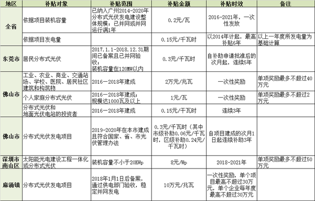 2019年8月16日,佛山市发改委、佛山财政局经市人民政府同意发布了《佛山市分布式光伏发电项目补助资金管理办法(2019-2020年)》分布式光伏发电项目按实际发电量补助0.3元/千瓦时(其中市级补助0.06元/千瓦时、区级补助0.24元/千瓦时),自项目建成的次月1日起连续补助3年。