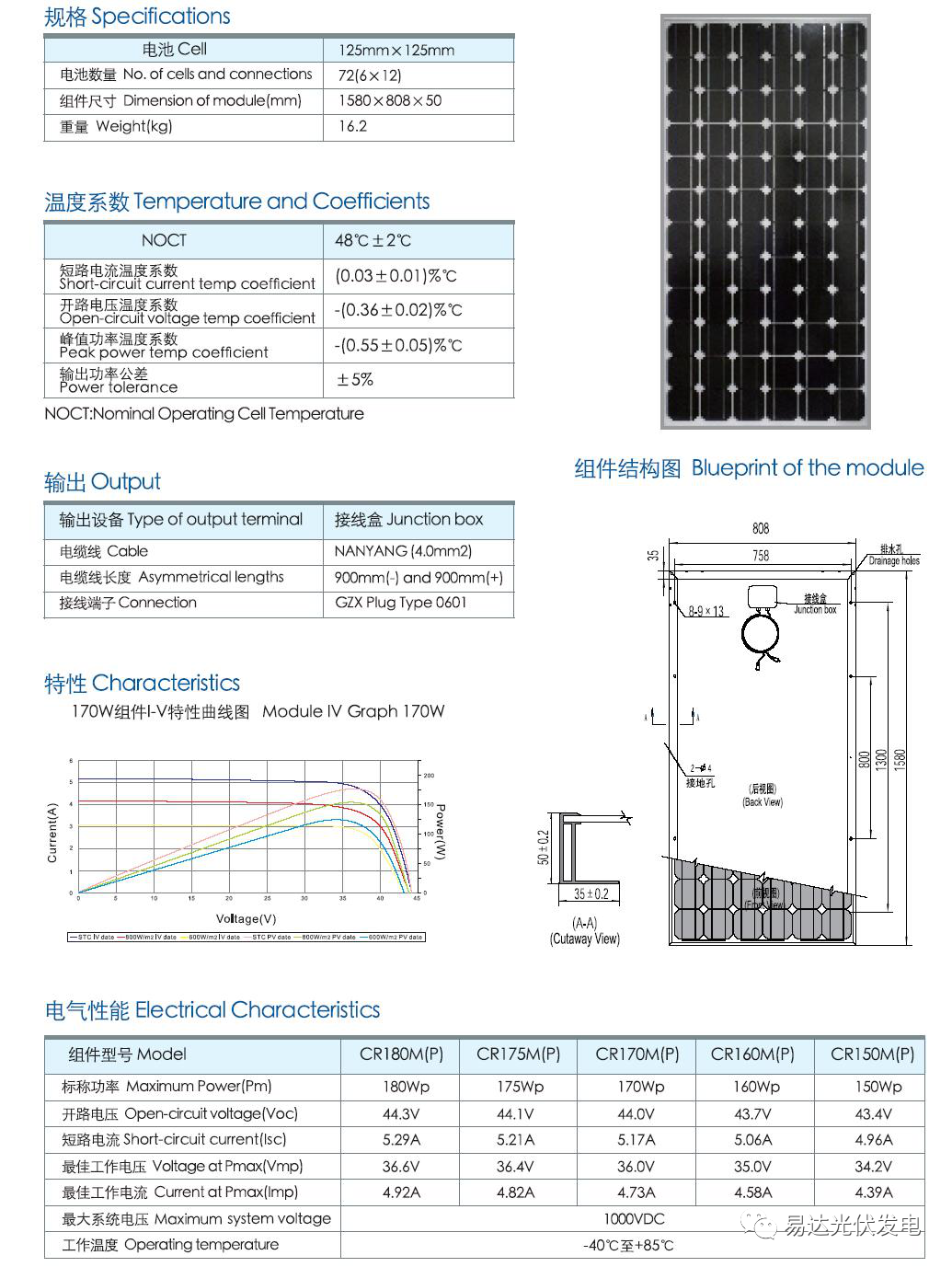 说明:1、本报价为系统的货物总价,包含安装、运输、施工等费用,直至系统正常运行。 2、其它项包括螺栓螺母、穿线管等配件费用; 3、本报价有效期为即日起15个日历日内。 4、系统的关键部件描述: 1) 太阳能电池板: 在太阳光的照射下将太阳能转换成电能输出,是整个光伏系统的核心部件。本系统采用电池组件共计200块,8块36V/170W(外形尺寸为1580×808×50)串联组成一组,然后进行并联,共计20组。我公司专业生产太阳能电池板,产品已经通过了CE、ISO9001、ISO14001认证,电池片效率20%以上,使用寿命25年以上。